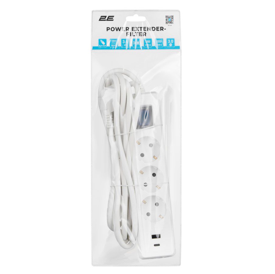Отзывы Сетевой фильтр-удлинитель 2E SP-315M-3USB-WH 3м, 3xТипF, 16A, 1xUSB-A,1xUSB-C