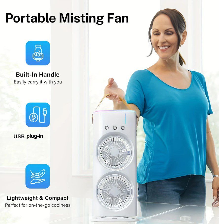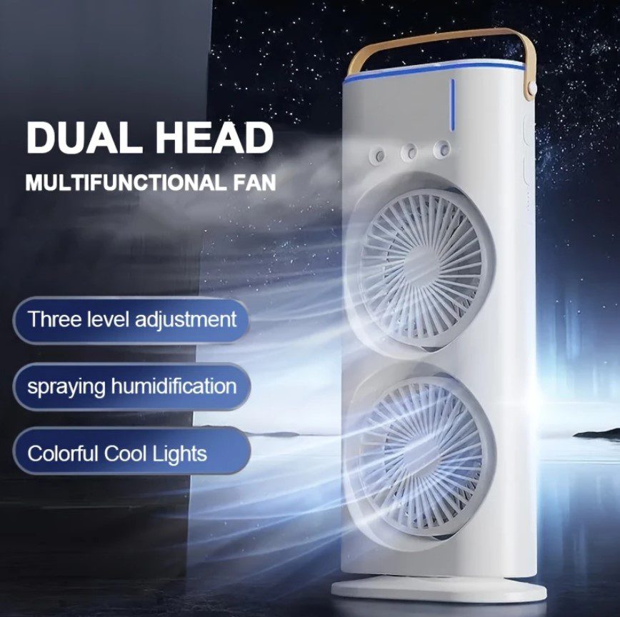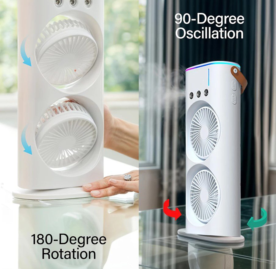 - 2 вентилятора поворачиваются влево-вправо на 90°, поток воздуха направляется на все 360°. Эффективно увлажняется воздух мелкодисперсными брызгами из емкости для воды и льда, температура быстро понижается на 10°С даже в самую большую жару.