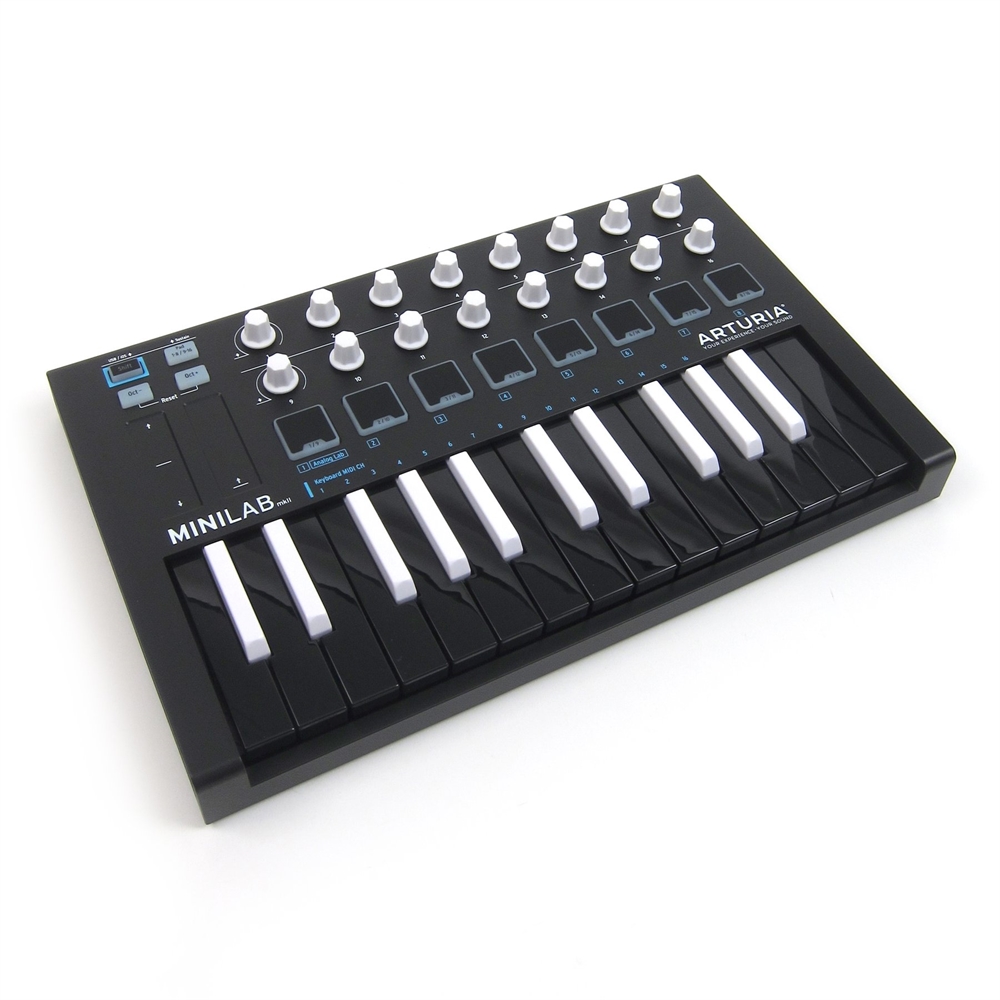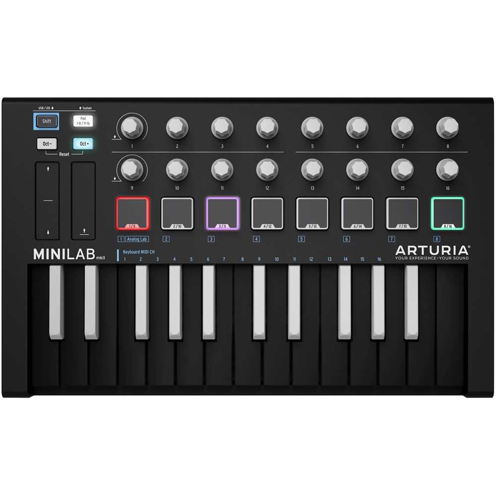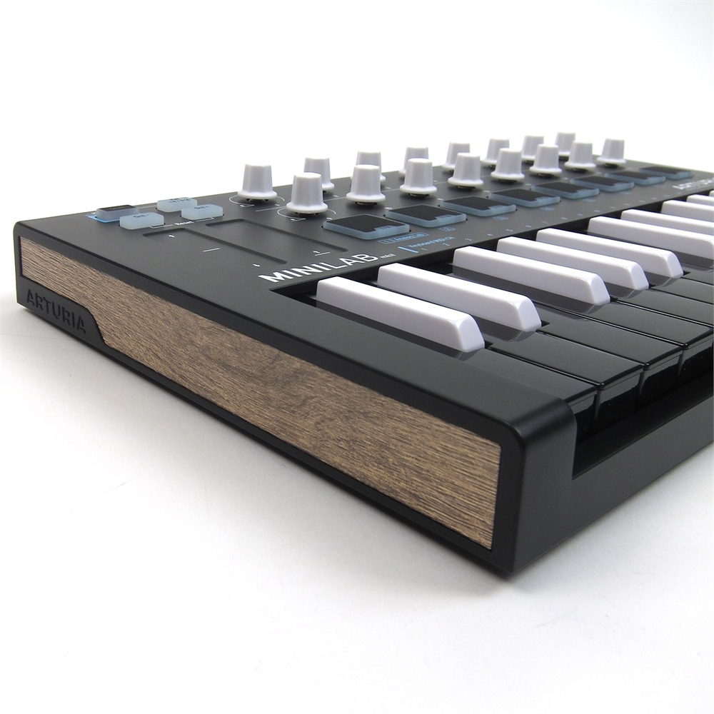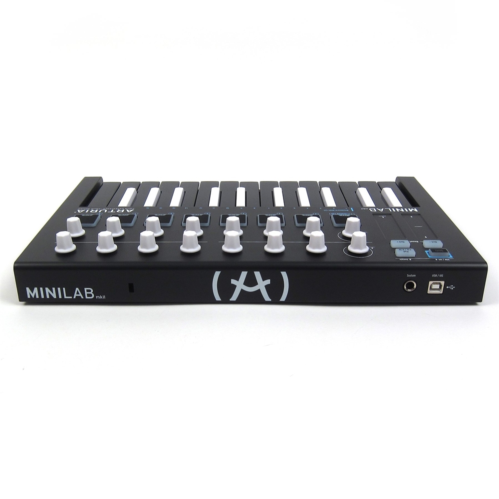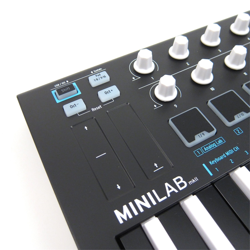 MiniLab MКII оснащен очень удобной клавиатурой на 25 тонких клавиш, 16 кнопками и 8 пэдами, а также сенсорными органами управления, благодаря чему способен успешно взаимодействовать с большинством виртуальных инструментов и ПО.