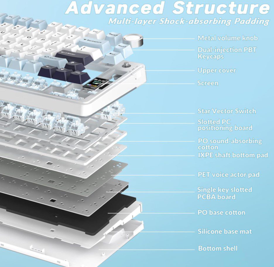 S75 Pro имеет усовершенствованную конструкцию: удлиненную интегрированную силиконовую прокладку и одиночную вырезку под каждый переключатель на PCB, что улучшает упругость и стабильность клавиш. Пятислойная шумоизоляция заполняет пространство между печатной платой, монтажной пластиной и переключателями, снижая резонанс и обеспечивая плотное, приятное нажатие.