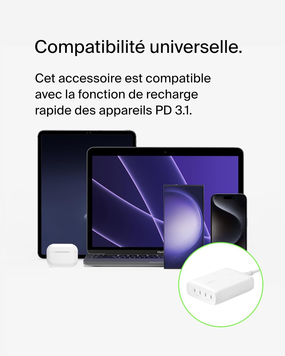 Модель отлично подходит для рабочих мест и дома: позволяет заменить сразу несколько зарядных блоков одним устройством. Поддерживает быструю зарядку для ноутбуков (включая MacBook), планшетов и смартфонов, что делает его универсальным решением “один адаптер для всего”.