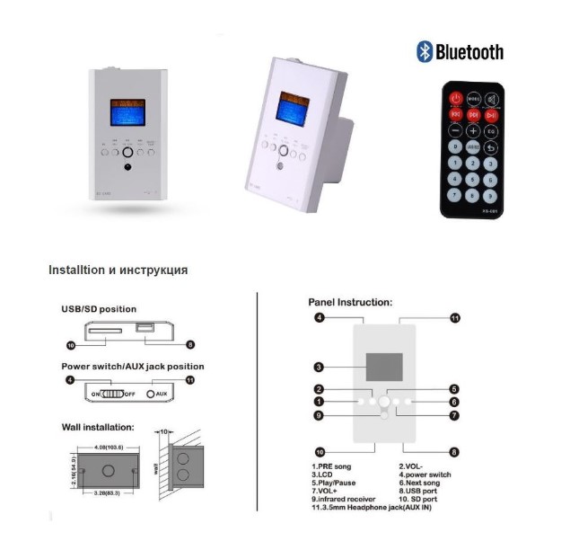 - Усилитель дополнительно имеет USB/SD/FM/MP3/AUX/BLUETOOTH входы
