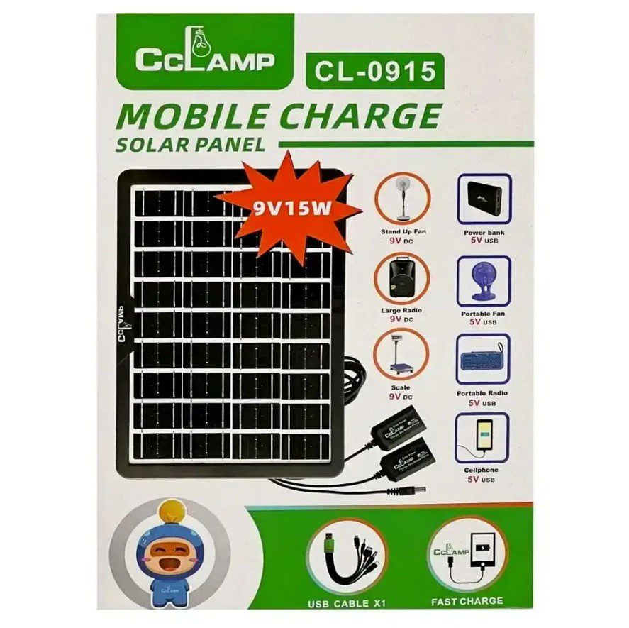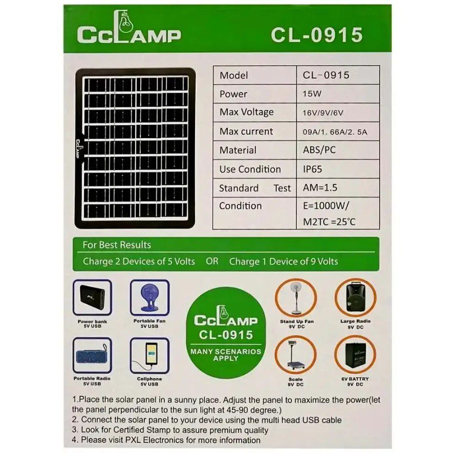 Панель CCLAMP CL0915 имеет 2 USB разъема для подключения или подзарядки гаджетов, а также 1 DC разъем повышеной мощности. Также имеет набор кабелей с разными разъемами для зарядки ваших девайсов. Монокристаллическая кремниевая солнечная панель от лидера рынка CCLAMP — это пример оптимального сочетания отличных технических характеристик, надежности и приятной для потребителя цены.