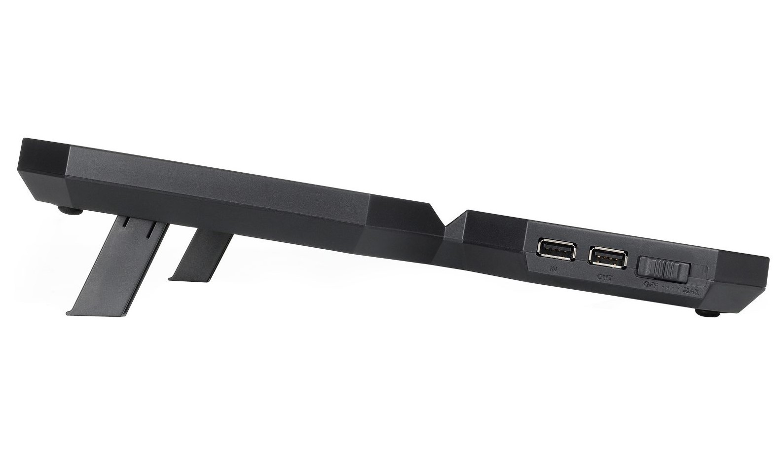 Свободное пространство между ножами подставки и её основанием позволяет легко подготовить устройство к работе и обеспечивает оптимальный угол обзора экрана ноутбука.