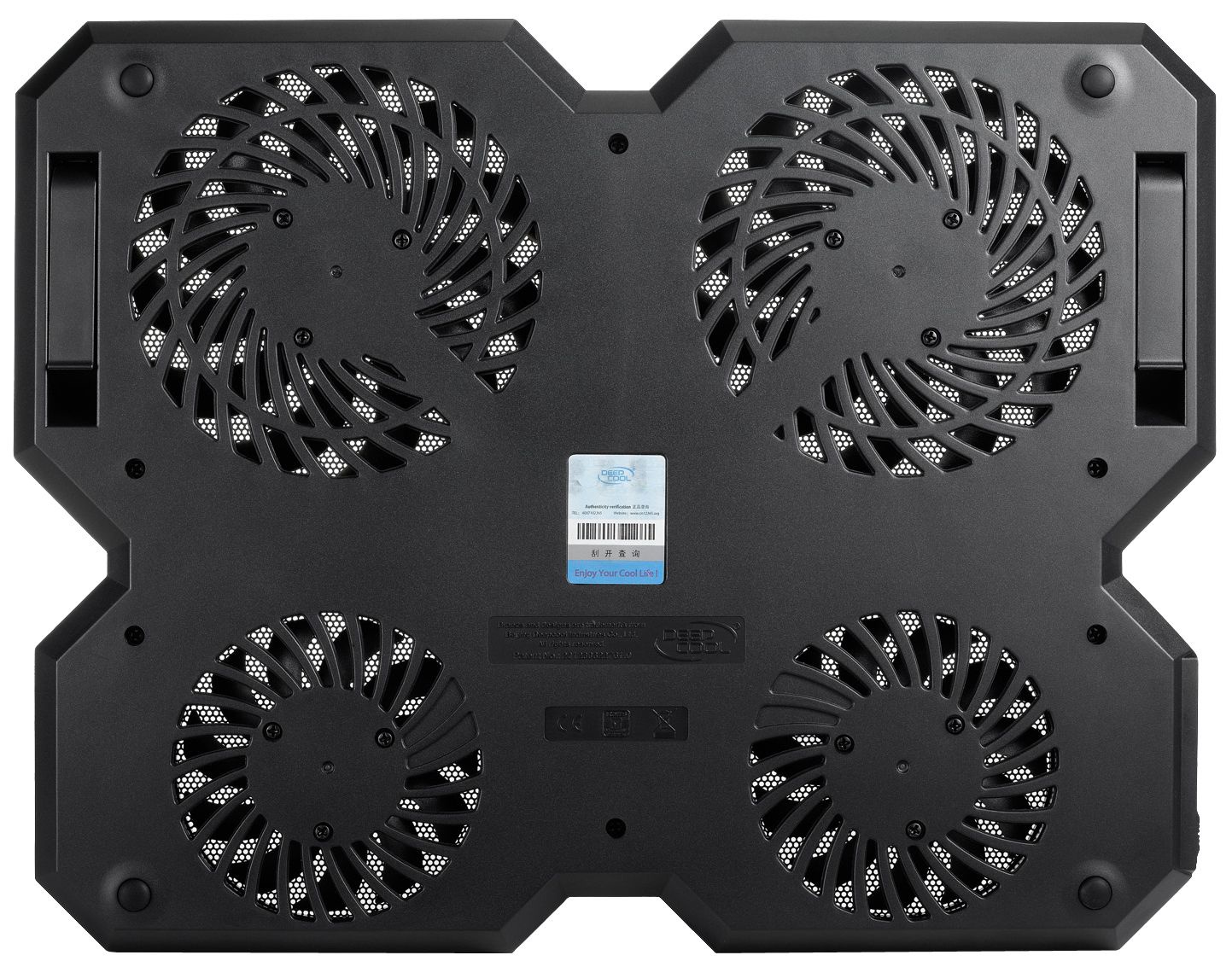 Четыре встроенных вентилятора создают мощный воздушный поток, который не оставляет ни одной «слепой зоны». Это позволяет одинаково эффективно охлаждать и участок корпуса, в котором находится накопитель ноутбука, и участок, где расположена видеокарта.