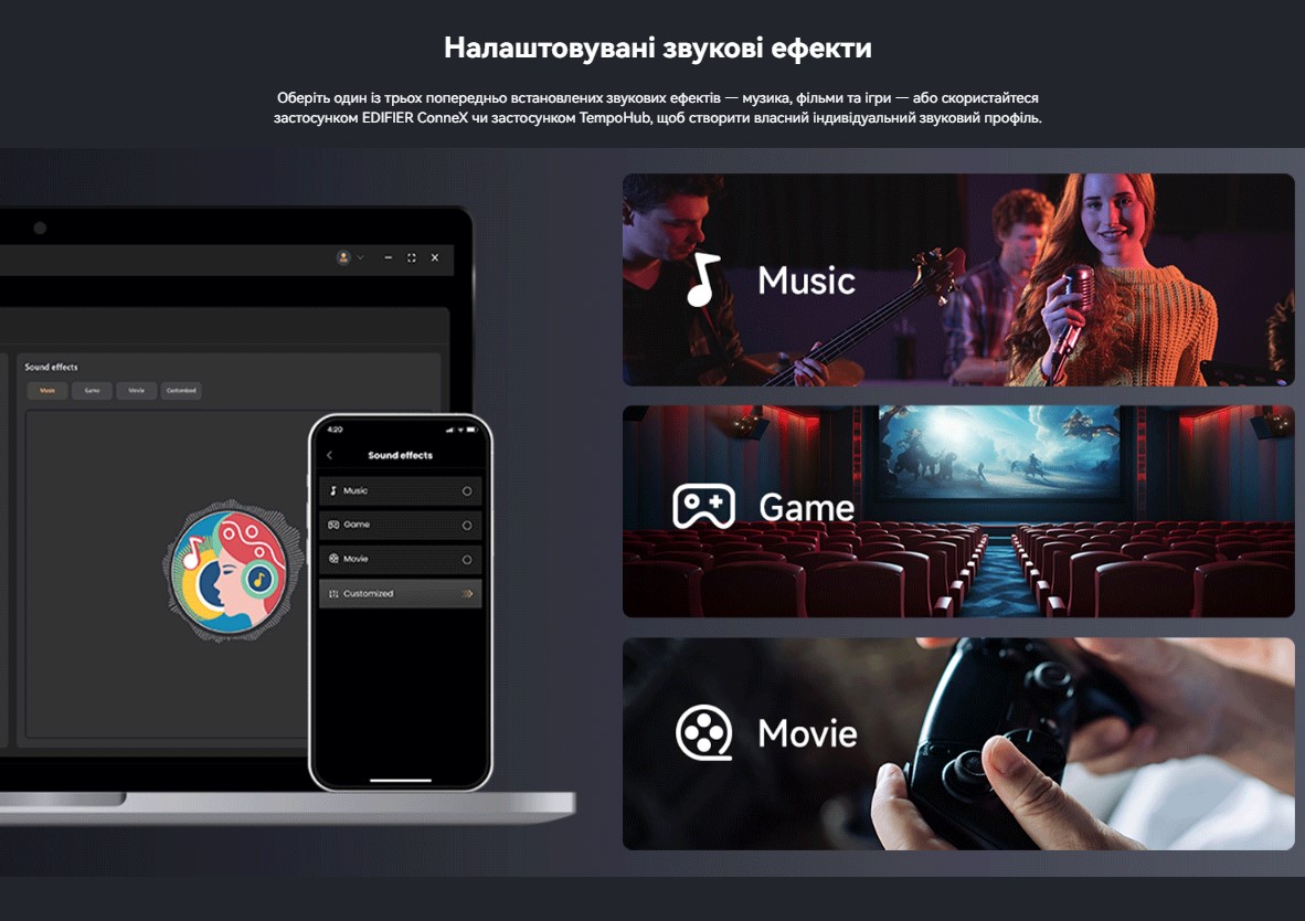 Выбирайте из трёх режимов — музыка, фильм, игра, или создавайте собственные пресеты через приложения.