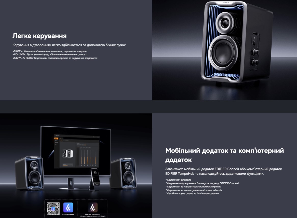 Загрузите EDIFIER ConneX (для мобильных устройств) или EDIFIER TempoHub (для ПК), чтобы раскрыть полный потенциал колонки: