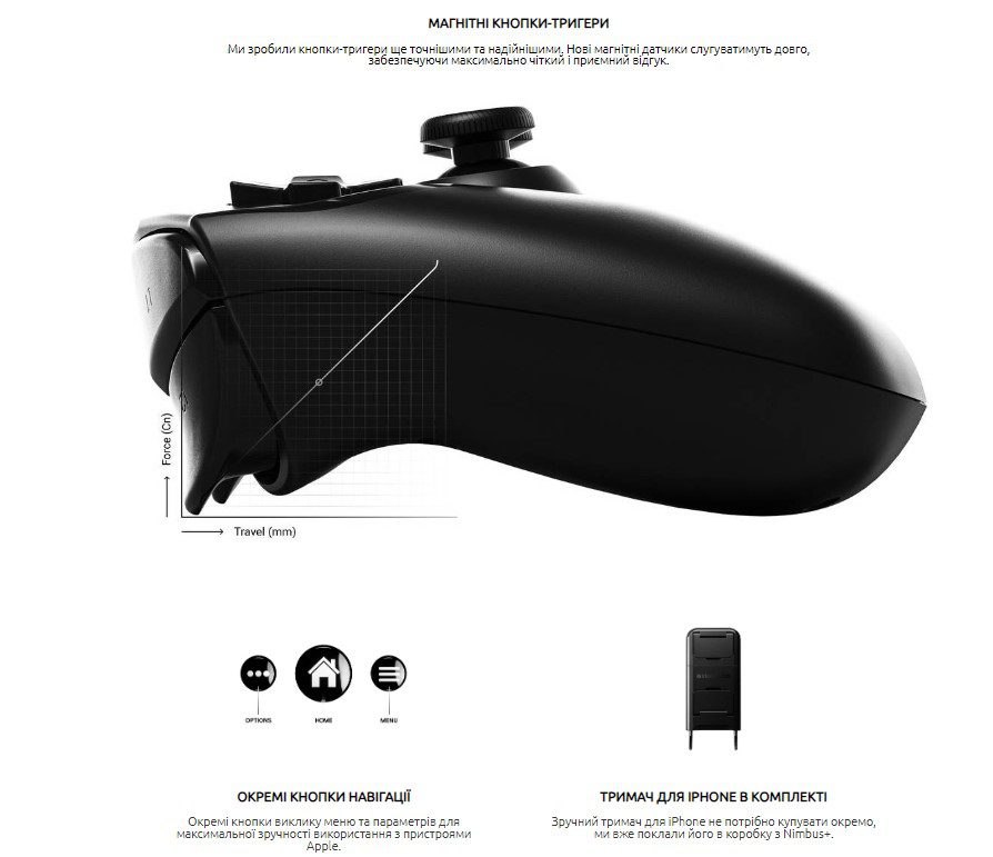 Геймпад подключается почти мгновенно. Достаточно нажать на небольшую кнопочку с задней стороны устройства, после чего поймать Nimbus+ в списке Bluetooth-соединений. Производитель отмечает, что гаджет безукоризненно работает с любой «яблочной» техникой: от старенького iPod Touch до Apple TV. Аппарат даже заряжается от Lightning-кабеля, нет нужды таскать с собой дополнительное ЗУ.
