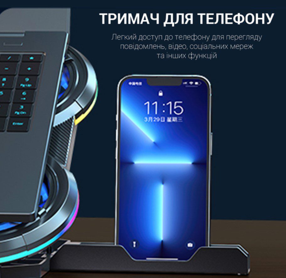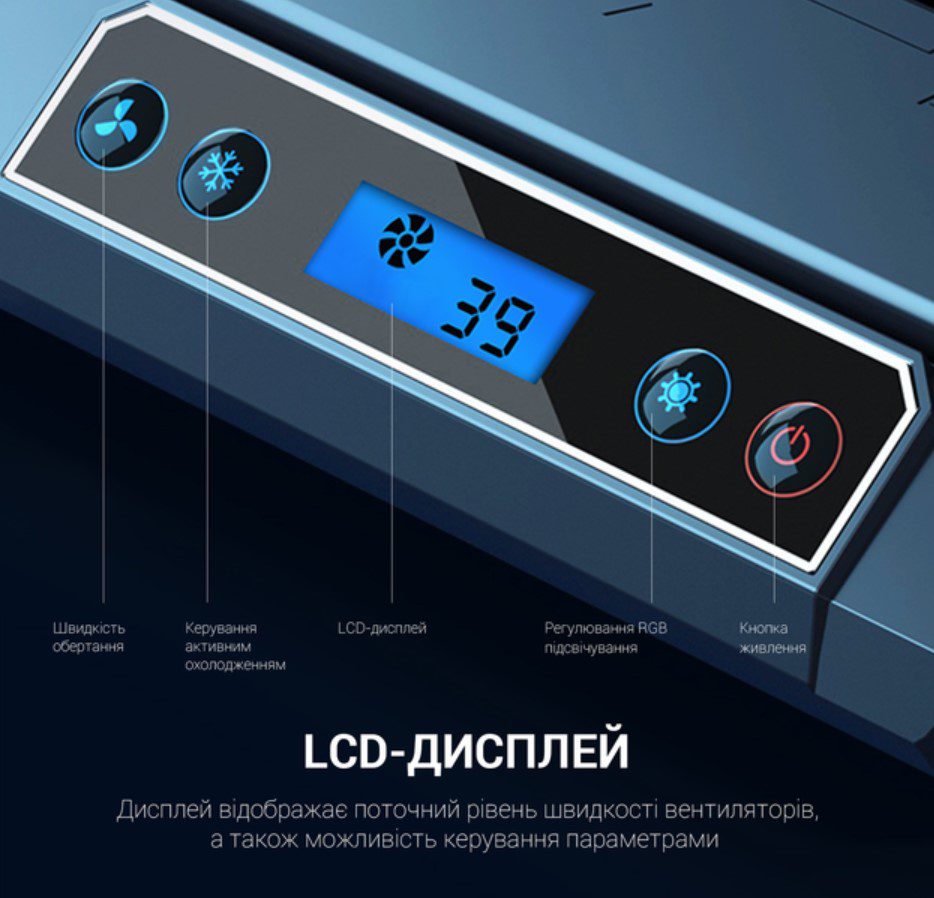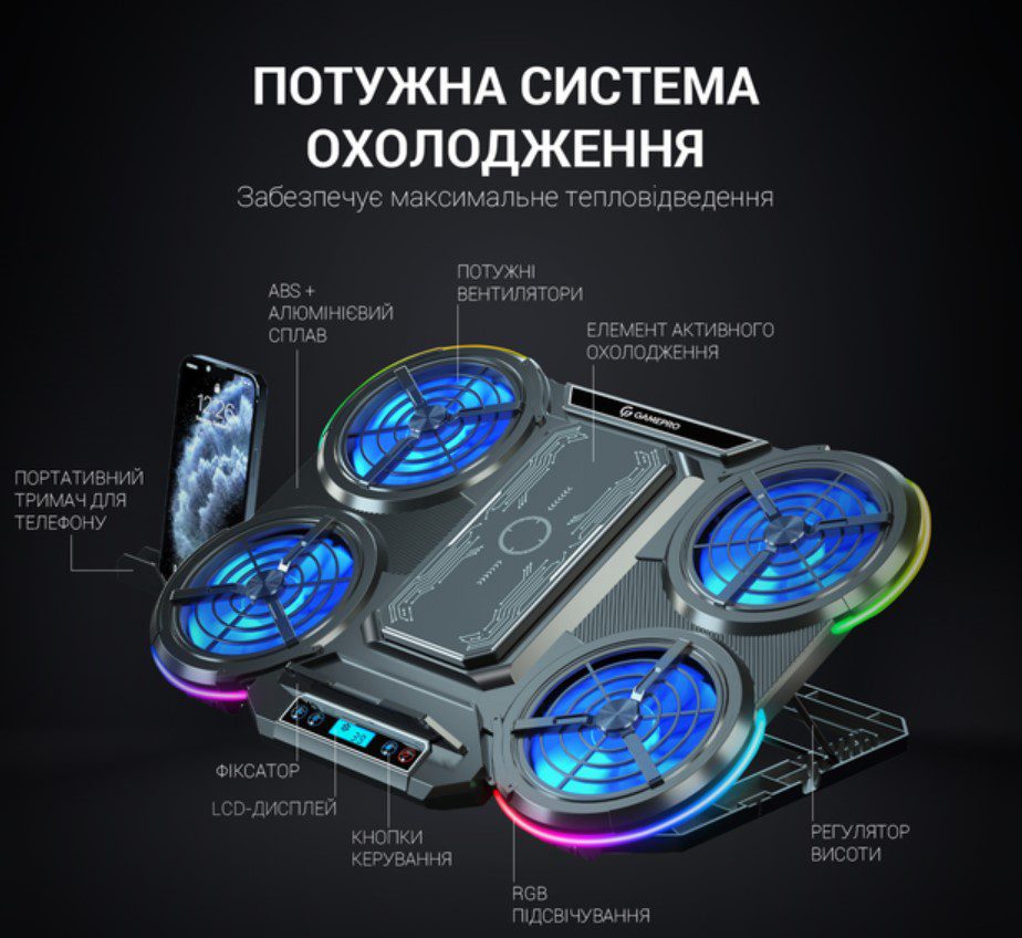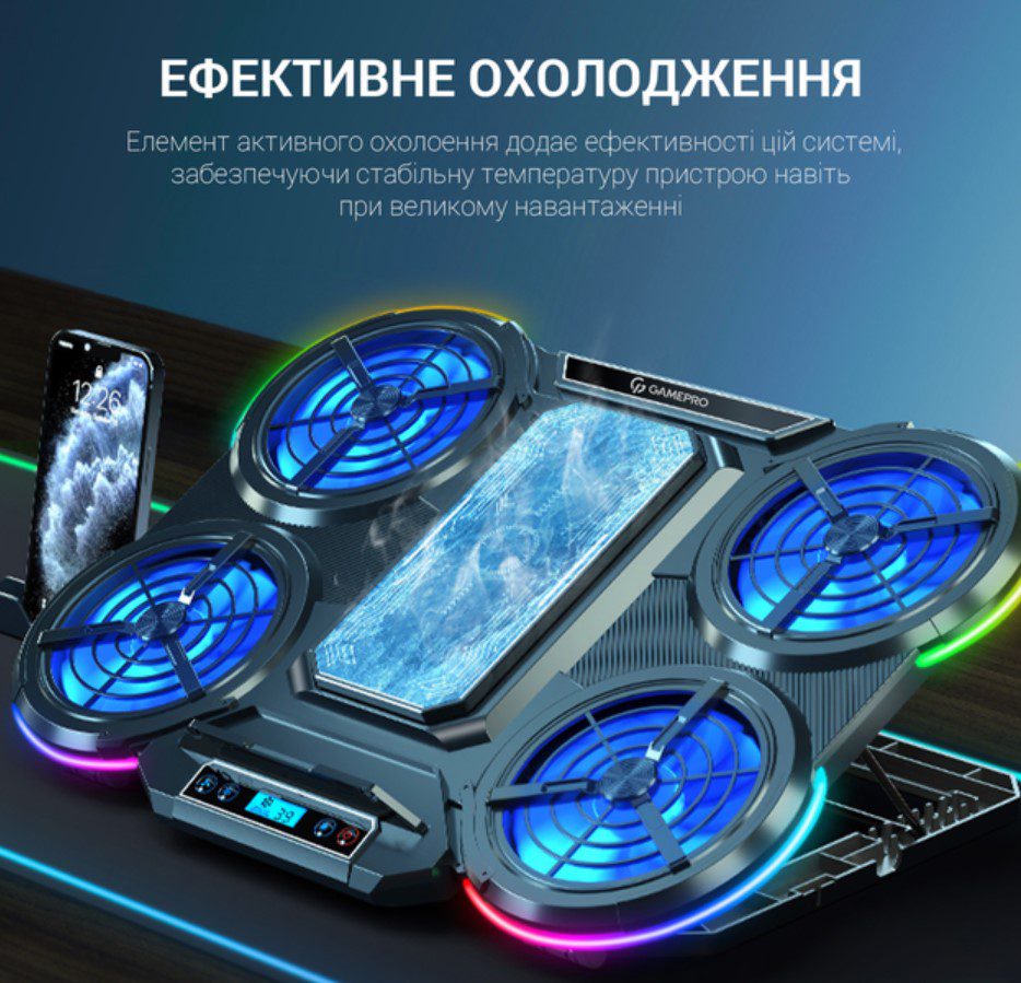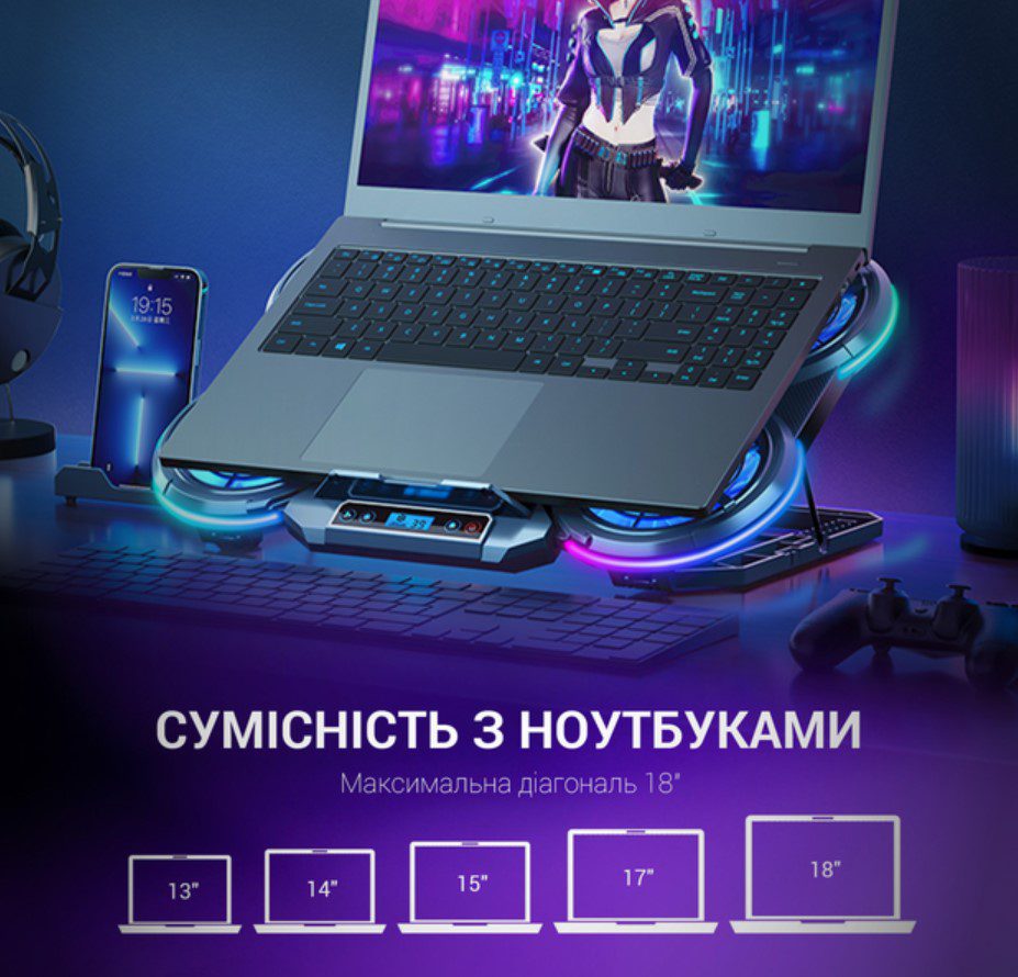 - Подставка также предлагает 7 различных настроек высоты, чтобы вы могли найти оптимальный угол для работы или игры. Удобный LCD-дисплей указывает на текущие параметры работы системы охлаждения, а держатель для смартфона позволяет вам удобно разместить ваше мобильное устройство рядом с ноутбуком.