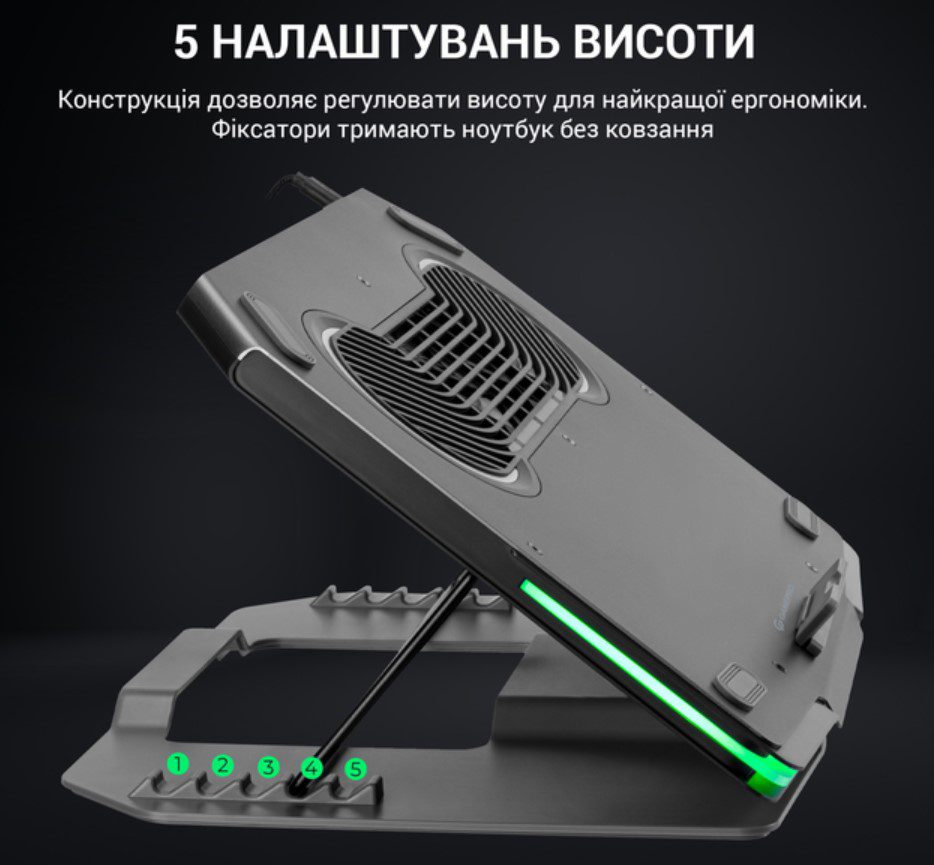 - Дополнительно регулировка наклона, регулировка скорости вентилятора, USB-хаб, фиксаторы ноутбука