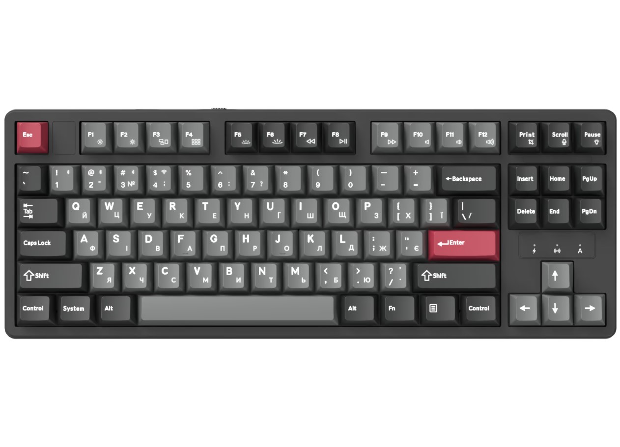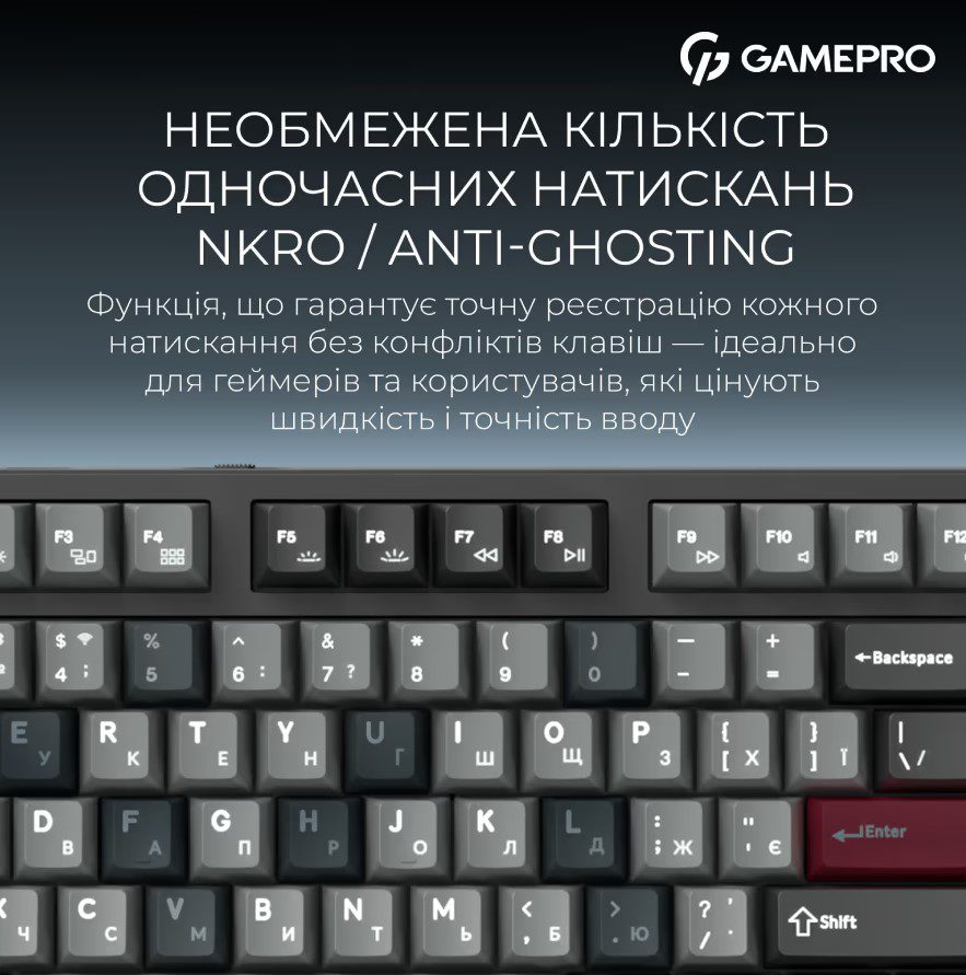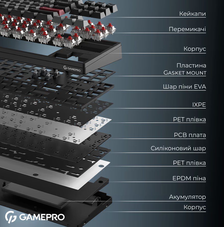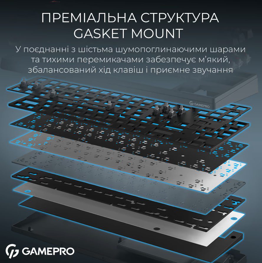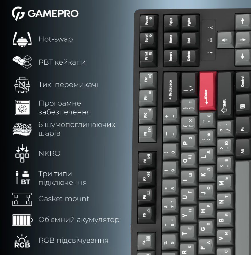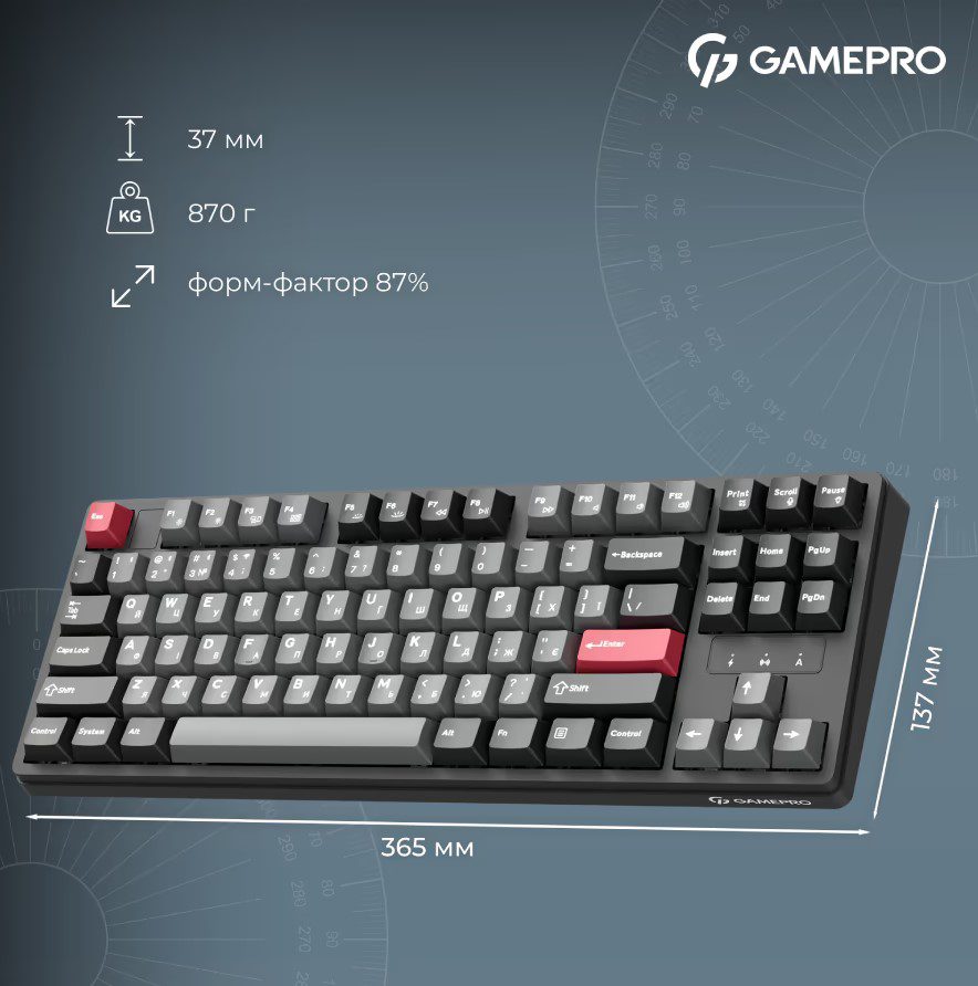 GamePro Asgard Ragnar – беспроводная 87% механическая клавиатура, сочетающая компактность, премиальные материалы и максимальный комфорт печати. Тихие смазанные Keychron Super Switch Red и gasket-mount конструкция с 6 слоями шумопоглощения обеспечивают мягкий ход и глухой, приятный звук. Три режима подключения – USB-C, Bluetooth 5.2, 2.4 ГГц, а батарея 4000 мАч гарантирует длительную автономность. PBT Cherry кейкапы, RGB-подсветка и hot-swap делают Ragnar универсальным и долговечным выбором. Стильная, тихая и технологичная – клавиатура для настоящего комфорта каждый день.
