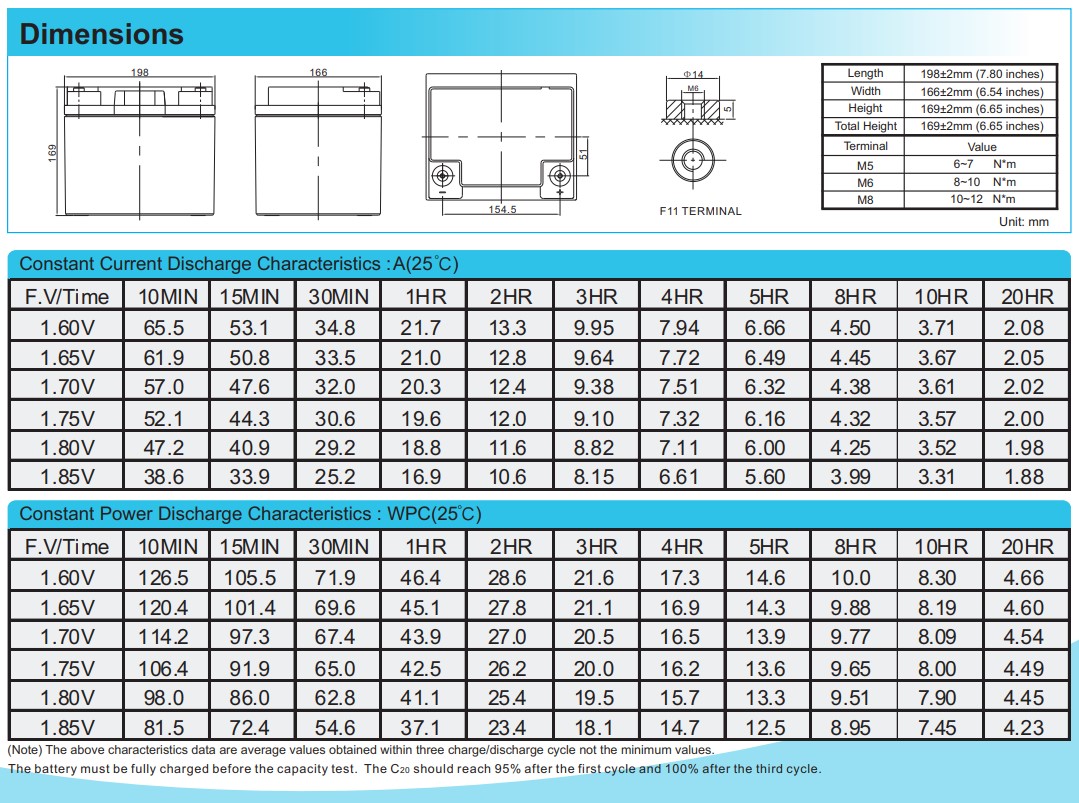 - Номинальная емкость: 40 A / ч при 20 часовом разряде до 1,75В на элемент при 25 ° C