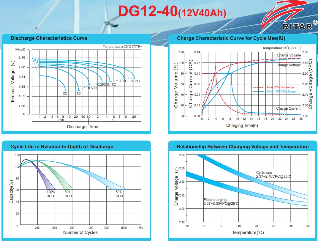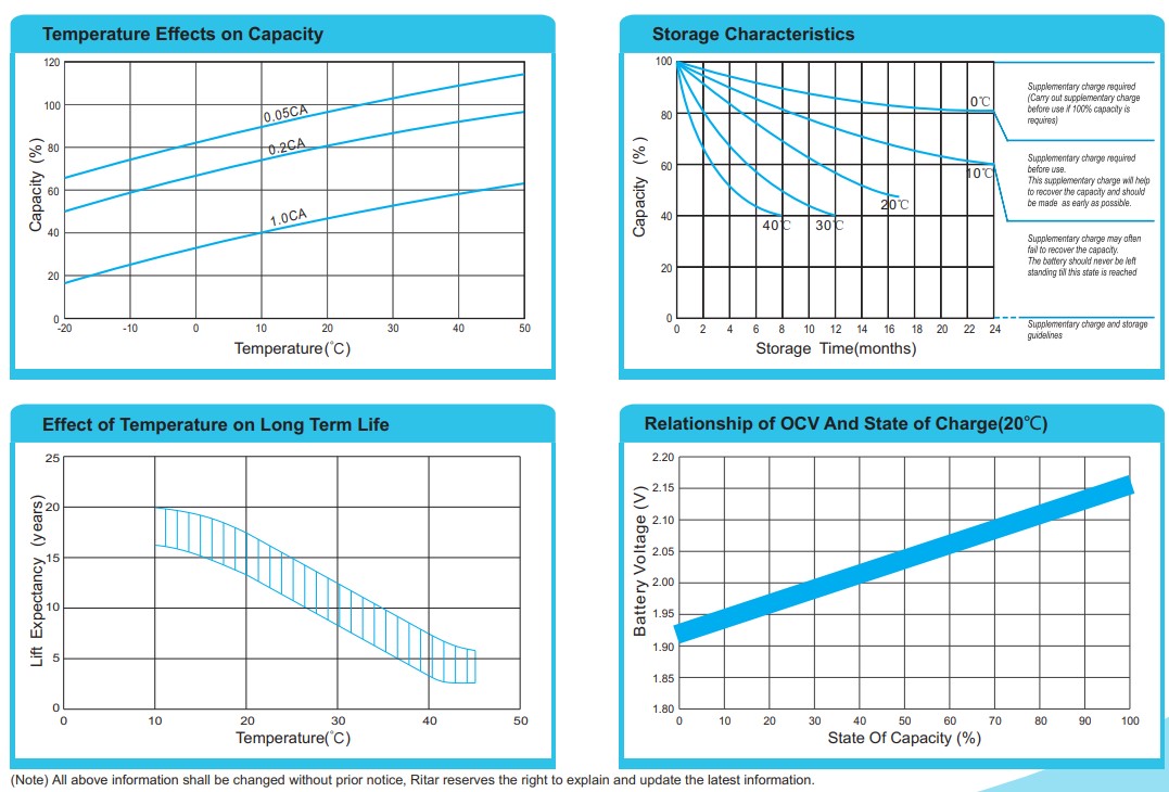 - Cаморазряд: Аккумуляторные батареи RITAR могут храниться до 6 месяцев при температуре 25 ° C, а затем рекомендуется подзарядка. Ежемесячный коэффициент саморазряда составляет менее 3% при 25 ° C. Пожалуйста, зарядите батареи перед использованием.