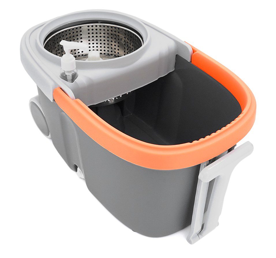 - Вместительное ведро обеспечивает достаточное пространство для чистой воды, а усовершенствованный механизм автоотжима предотвращает излишнюю влагу на насадке.