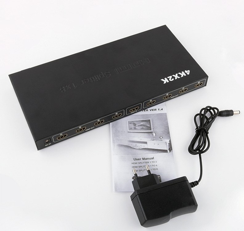 HDMI splitter 1×8 4Kx2K разделитель позволяет одному устройству HDMI легко разделяться на восемь совместимых мониторов или проекторов HDMI. Разветвитель также может быть помещен в конце длинного кабеля HDMI для регенерации HDMI сигнала. Разрешение HDMI до 4 К x 2 К/30 Гц.