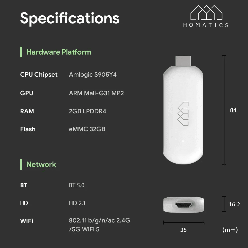 Homatiks 4K Stick 2/32GB – компактная и мощная ТВ-приставка для вашего телевизора, которая обеспечит удобный доступ к онлайн-контенту в высоком качестве.