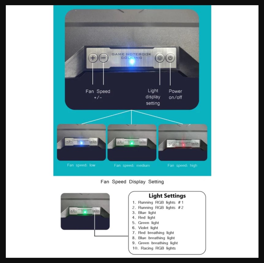 Двойной турбовентилятор сзади, холодный воздух выталкивается из небольшого отсека, в котором находится вентилятор, нагнетая сжатый воздух под ноутбук и рассеивая горячий воздух по бокам охлаждающей подставки.