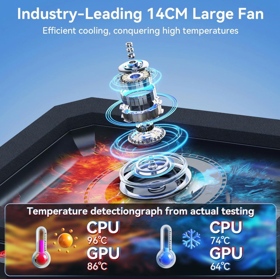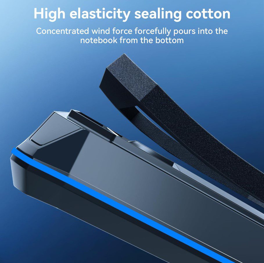 Более мощный вентилятор, более быстрое охлаждение: новая модернизированная версия охлаждающей подставки для ноутбука оснащена мощным внешним турбовентилятором диаметром 5,5 дюймов (14 см), обеспечивающим охлаждение на 360 градусов и исключающим утечку воздуха.