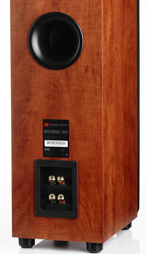 JBL Studio 180 CH это классическая башня, стоящая на шипах и отделанная натуральным вишневым шпоном. Ее кабинет изготовлен из плит MDF, которые имеют конструкцию сэндвича — между двумя слоями впрессован демпфирующий материал. А вот оформление фасада несколько необычное — не броское, но явно сугубо дизайнерское.