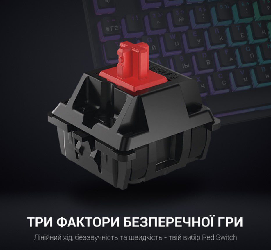 - Благодаря механическим переключателям Red Switch клавиатура обеспечивает быстрый отклик и точность при каждом нажатии, что делает её идеальным выбором как для геймеров, так и для тех, кто работает с текстами.