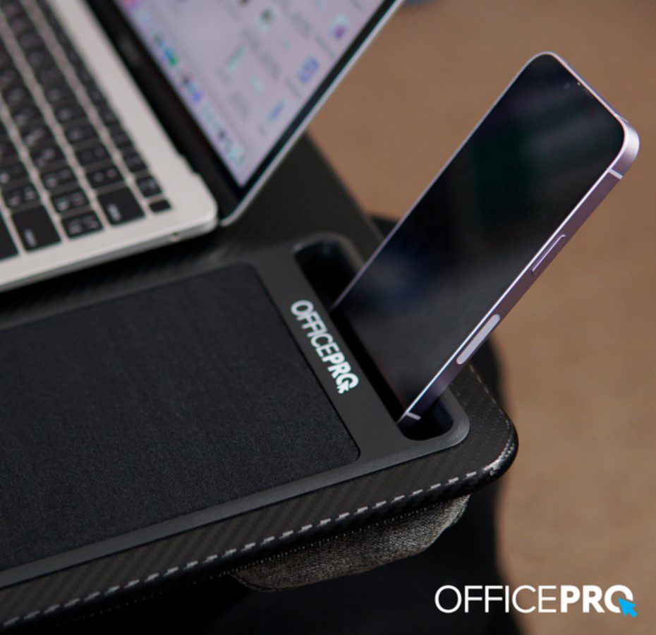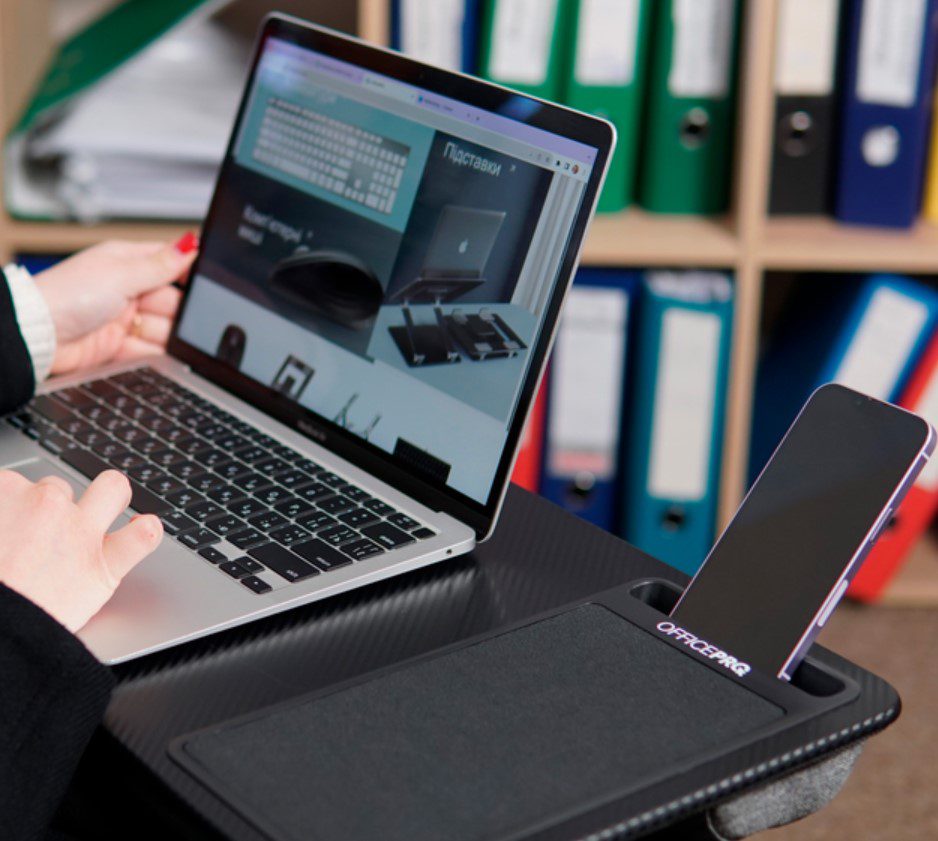 - Увеличьте рабочую поверхность, используя слот для телефона. Может удерживать большинство телефонов вертикально или горизонтально.