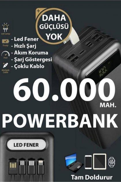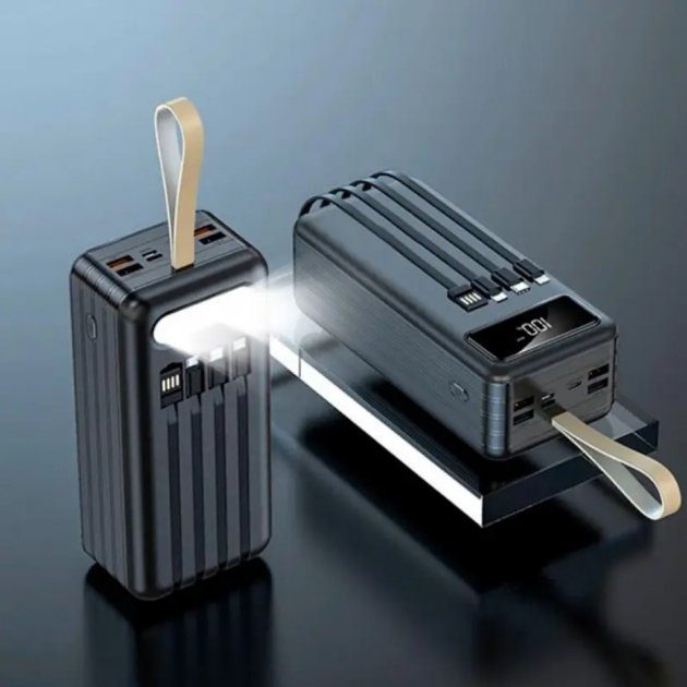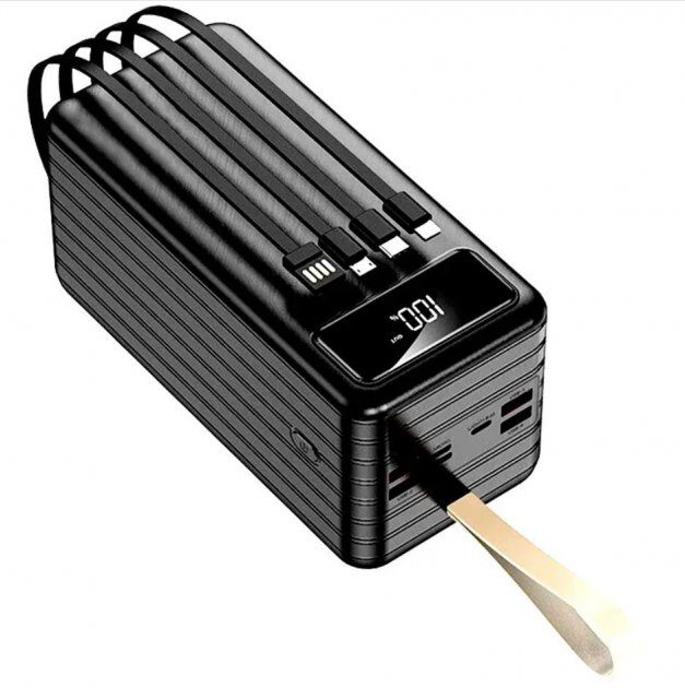 Корпус устройства изготовлен из прочного пластика. На корпусе расположен дисплей, на котором отображается уровень заряда батареи, а также сила тока и напряжение. В данной модели 4 USB-порта и 3 разъема: Type-C, micro-USB и Lightning. Также на корпусе устройства есть светодиодный фонарик, который включается двойным нажатием кнопки, расположенной сбоку. Помимо этого, в данном повербанке есть кабеля со всеми разъемами: Type-C, micro-USB и Lightning, что весьма удобно.