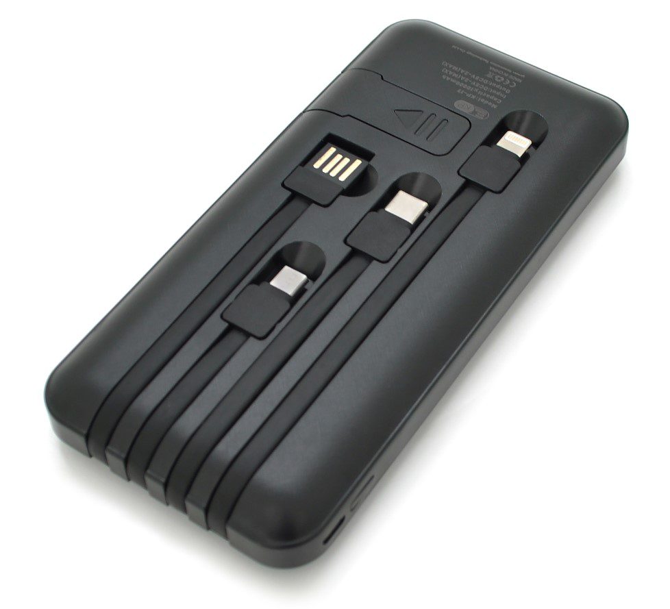 - Встроенный кабель для зарядки (USB, Type-C, Lightning, microUSB)