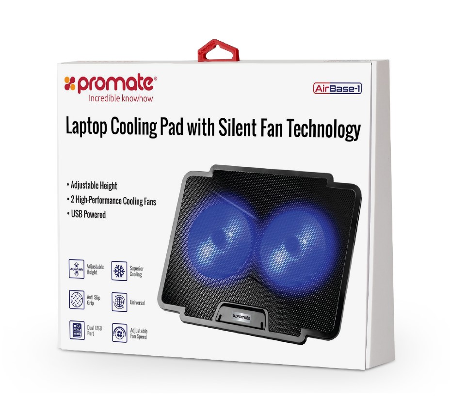 Promate AirBase-1 – компактная и мощная подставка для охлаждения ноутбука. Два 140-мм вентилятора с подсветкой под металлической перфорированной поверхностью, регулировка угла наклона и интенсивности охлаждения – все это делает гаджет отличным выбором когда нужно сбросить лишние градусы.