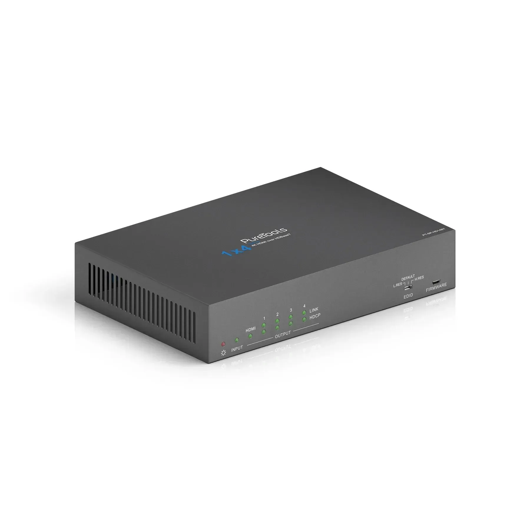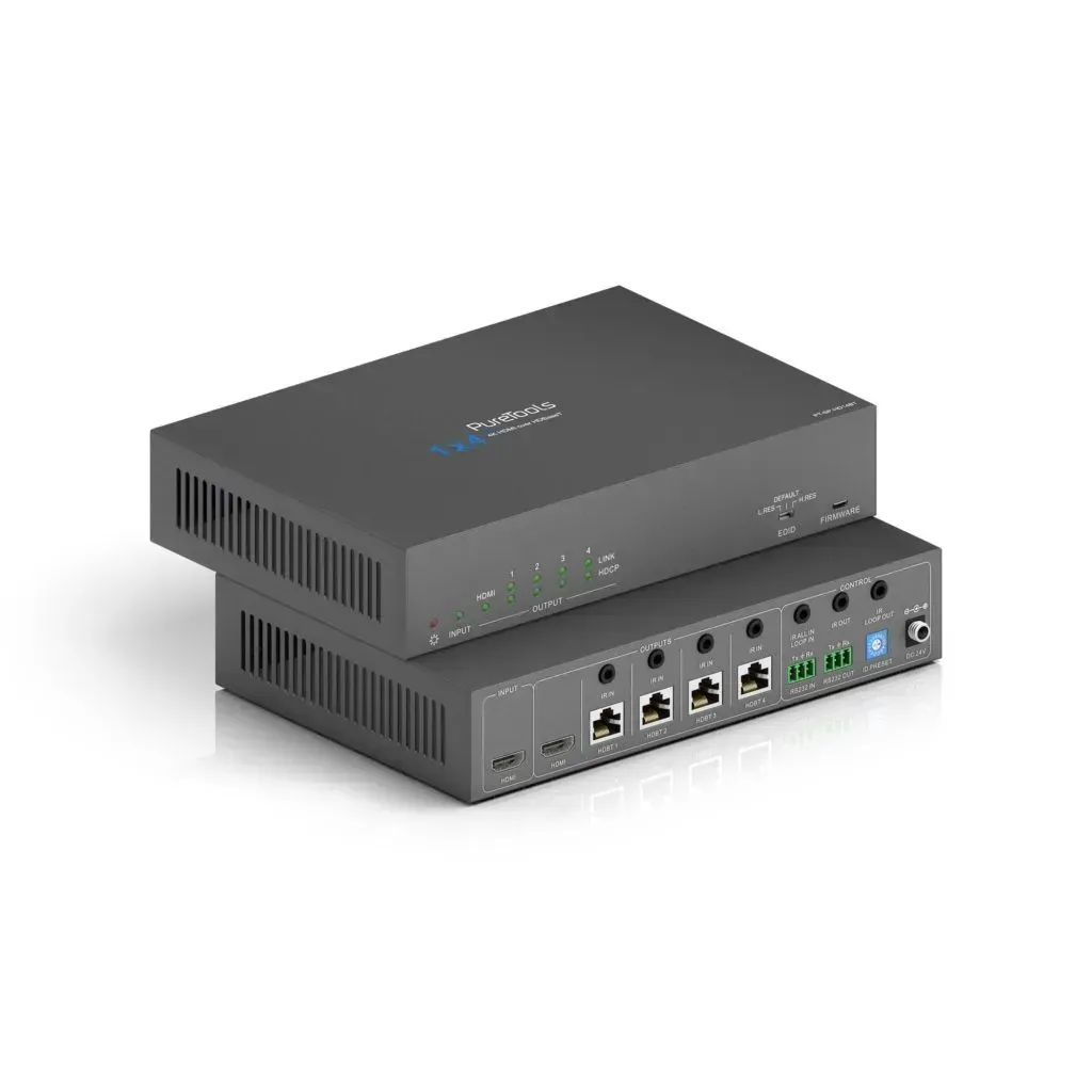 PURELINK PT-SP-HD14BT — это профессиональный сплиттер, который преобразует один HDMI-сигнал в четыре HDBaseT выхода для передачи видео, аудио и управления на большие расстояния по витой паре. Устройство поддерживает разрешение до 4K и предназначено для сложных AV-инсталляций, где требуется удалённое подключение нескольких дисплеев.