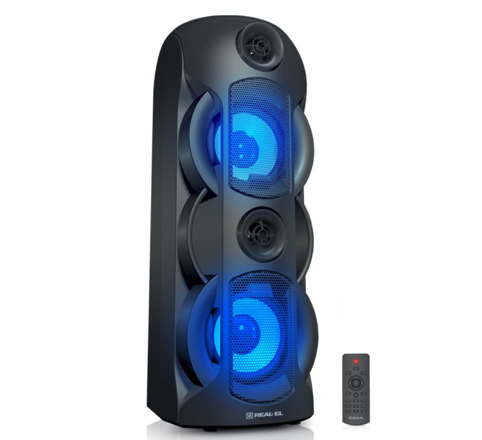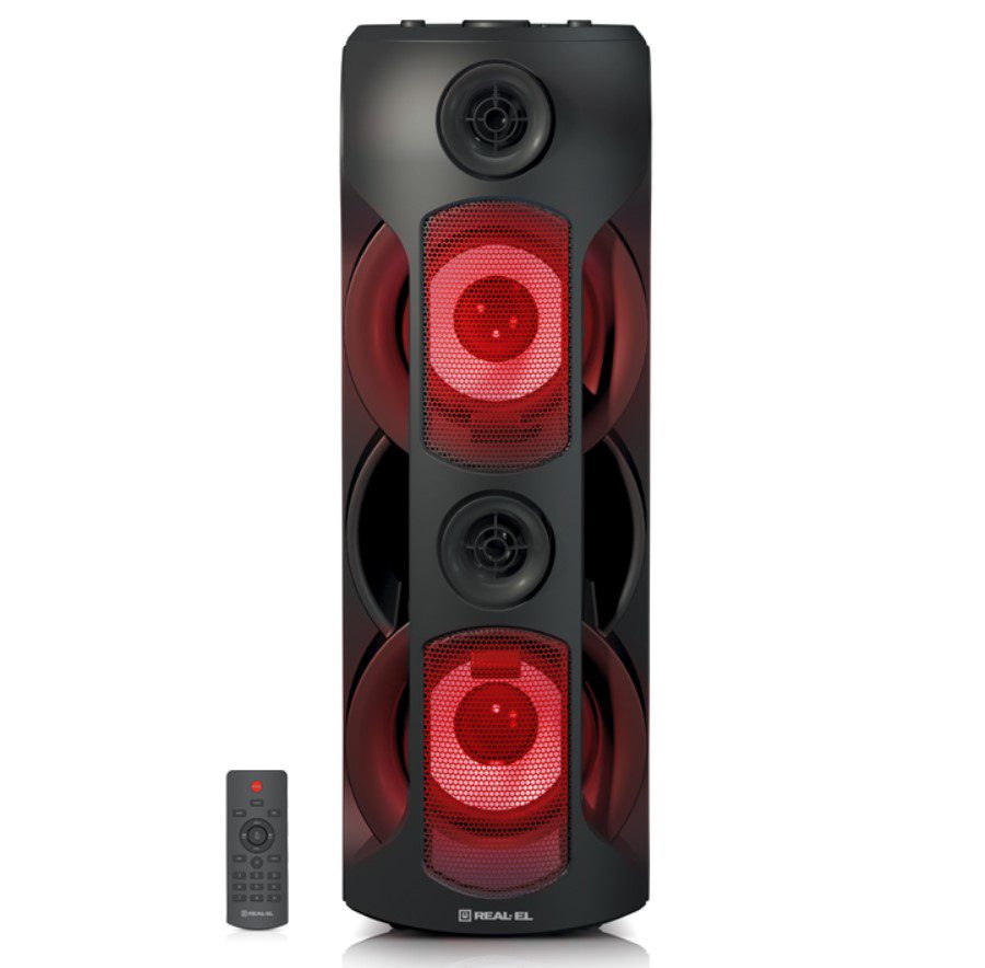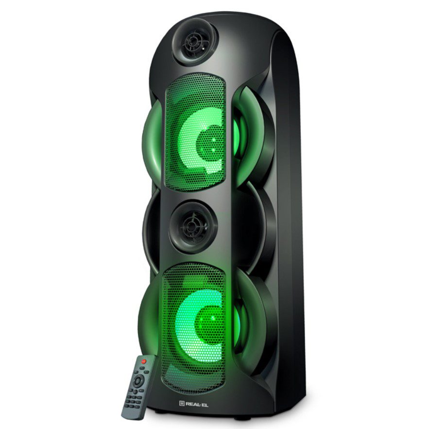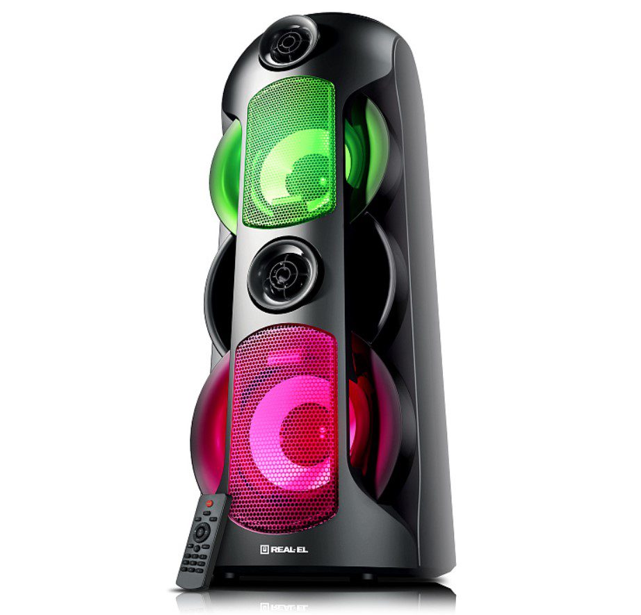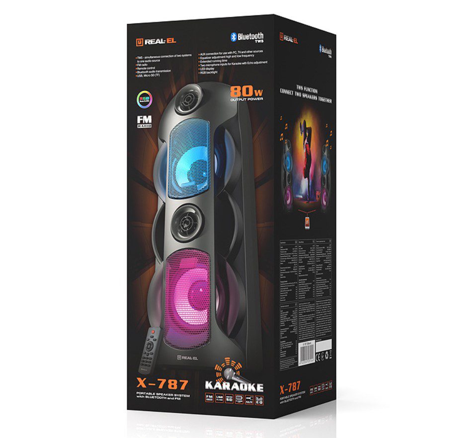 - Мультимедийная портативная акустическая система REAL-EL X-787 имеет современный дизайн с RGB подсветкой и качественным мощным 80-ти Ваттным звучанием.