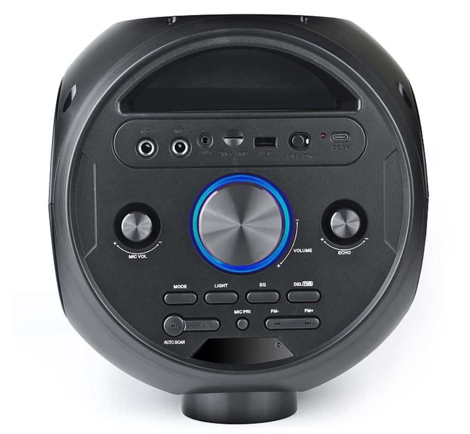- Широкий функционал «бумбокса» позволяет прослушивать музыку подключая мобильные устройства, ПК, TV, ноутбуки и т. п., как через вывод AUX, так и по Bluetooth. USB и Micro SD card разъемы дают возможность прослушивать аудио-файлы с flash носителей.