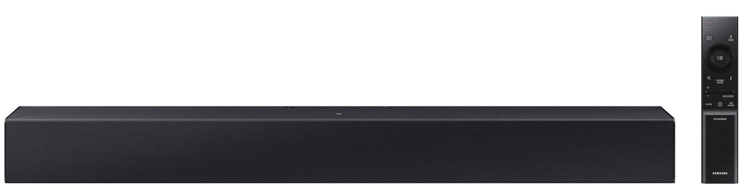 Саундбар Samsung HW-C400 — Почувствуйте гулкий бас со встроенным низкочастотным динамиком. Наполните дом звучанием с помощью этого универсального устройства со встроенным НЧ-динамиком, который улучшает производительность басов. Единственный пульт One Remote. Один пульт для полного контроля. Используйте пульт до телевизора Samsung для управления как телевизором, так и ключевыми функциями саундбара, громкость и даже звуковые эффекты. Функции и дизайн пульта дистанционного управления могут отличаться в зависимости от модели телевизора и региона.