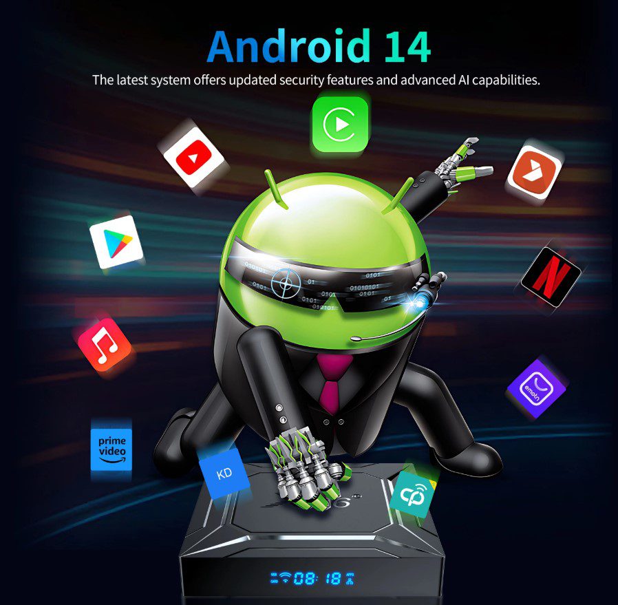 - Android 14 TV Box — новейшая система с обновленным интерфейсом