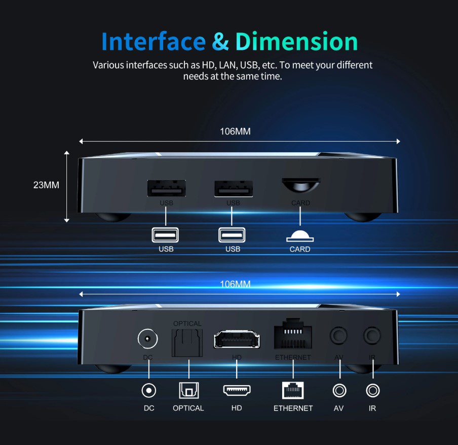 - Разъемы: HDMI-out – 1 шт, USB 2.0 – 2 шт, MicroSD, AV-выход, Ethernet 1000 Мбит/с, SPDIF, IR-вход (для удлинителя ИК-порта)