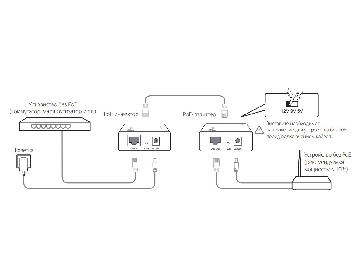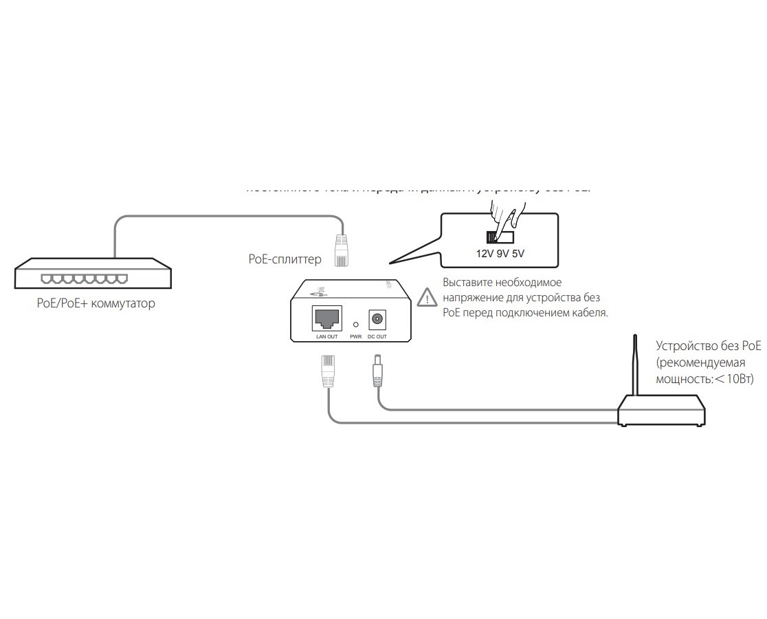 - Только PoE-сплиттер POE-10R — PoE-сплиттер может использоваться совместно с PoE/PoE+ коммутатором для подачи постоянного тока и передачи данных к устройству без PoE.