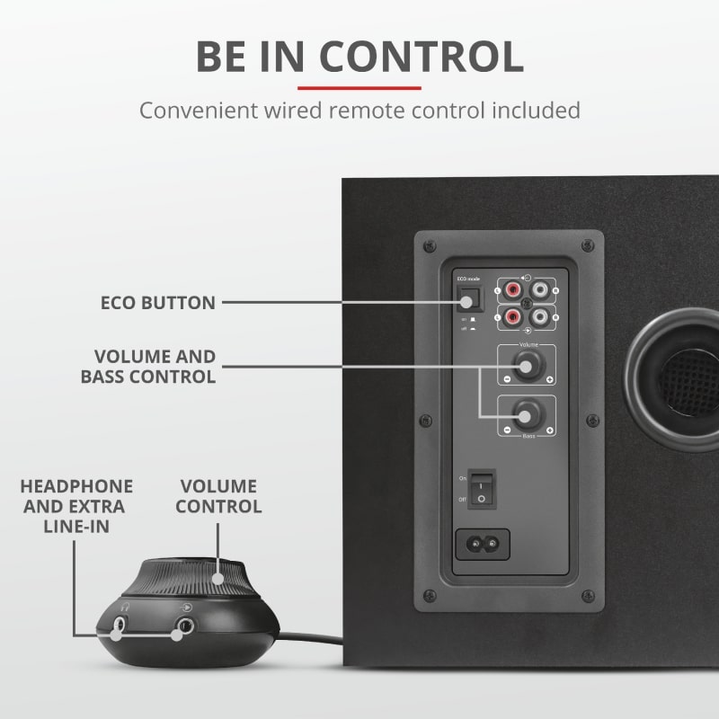 - Дополнительные регуляторы громкости и низких частот на сабвуфере