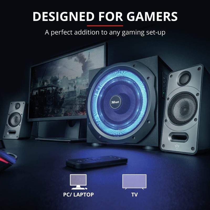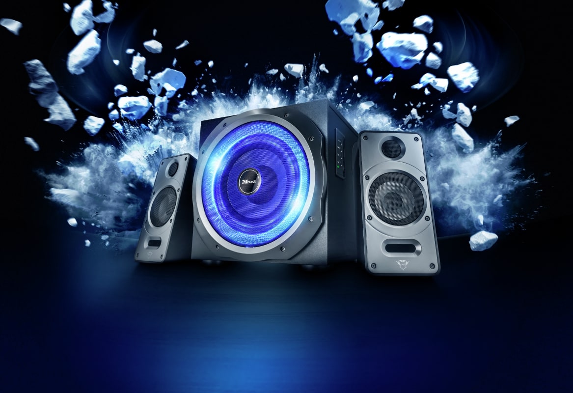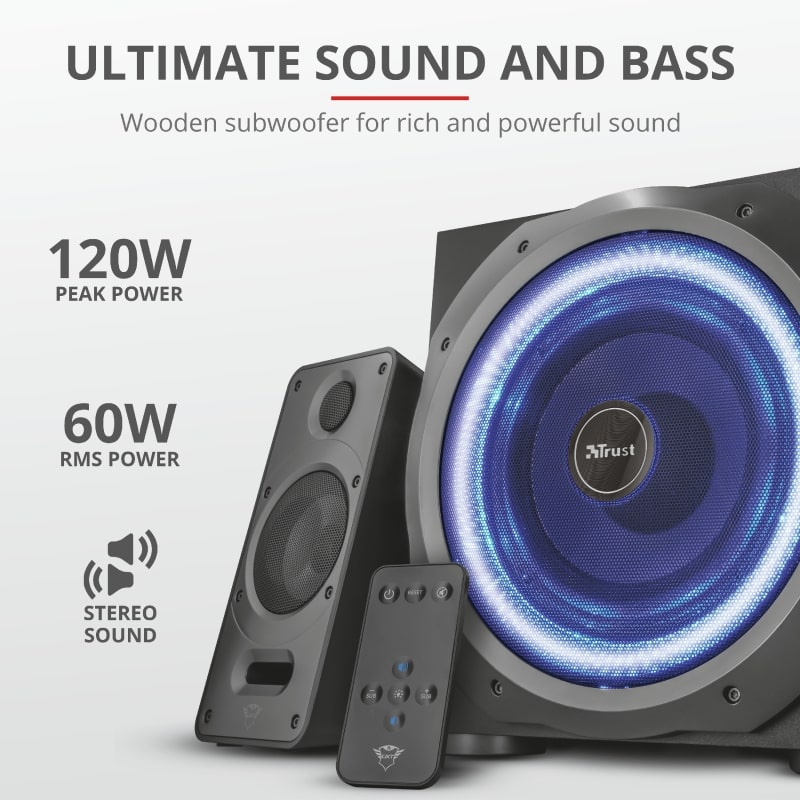 Trust GXT 688 Torro Illuminated — Набор колонок 2.1, включая деревянный динамик низких частот (сабвуфер), с среднеквадратичной выходной мощностью 60 Ватт (пиковая мощность 120 Вт). Благодаря кабеля, входящего в комплект, вы можете легко подключить не только ваш ПК, телевизоры, смартфоны и планшеты. Динамик имеет оригинальный дизайн с пульсирующим светодиодной сабвуфером: теперь вы можете не только слышать, но и видеть звуки!