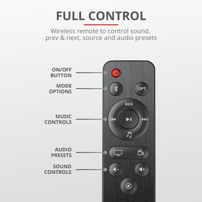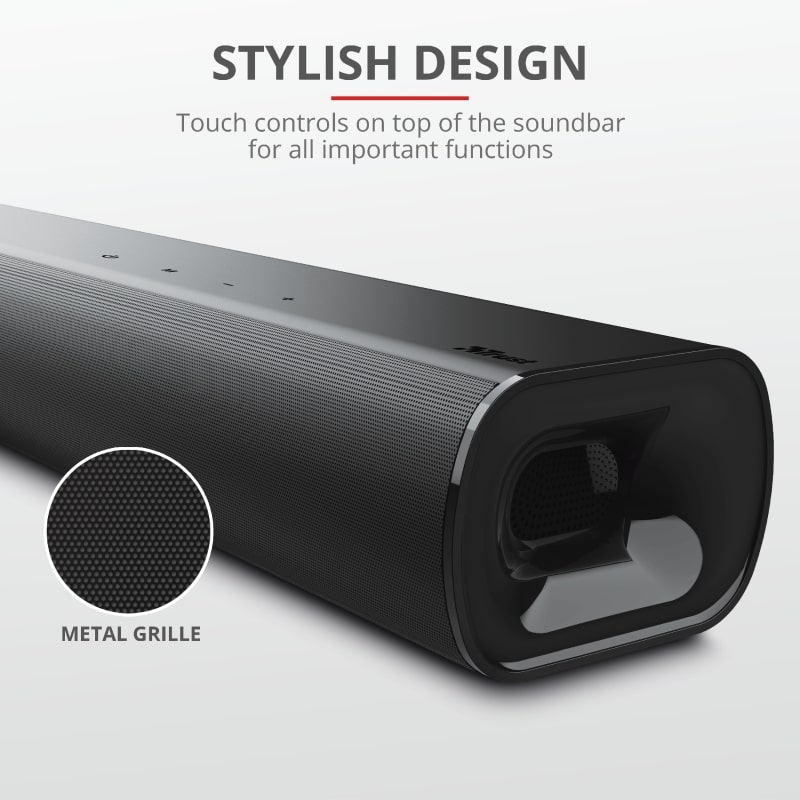 Trust Lino HD Soundbar with Bluetooth — может похвастаться мощным насыщенным стереозвуком благодаря технологии DSP и пиковой мощностью 80 Вт, а также с 3 предварительными настройками звука — для прослушивания музыки, просмотра телевизора или просмотра фильма.