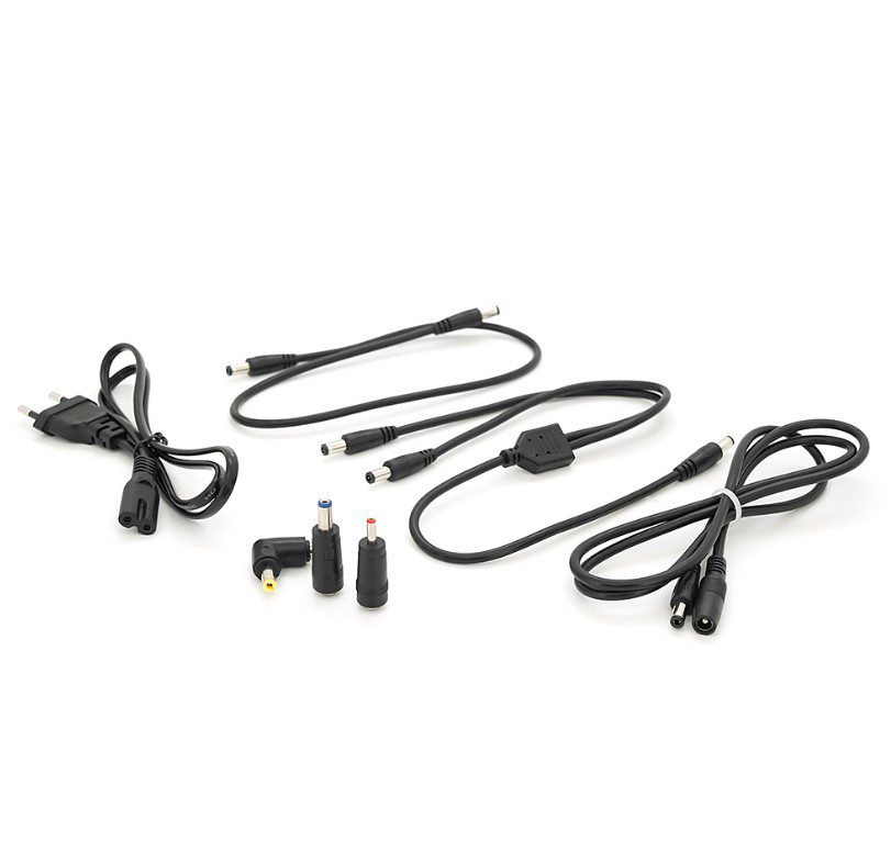 - Комплект переходников (5.5×2.5 мм на 5.5×2.1 мм, 5.5×1.35 мм, угловой 5.5×2.5 мм)