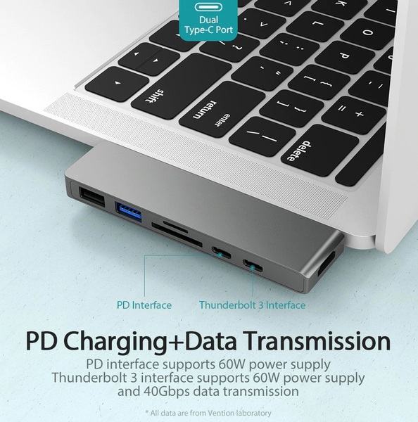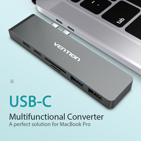 Мультифункциональный хаб Vention Aluminum 7 in 1 USB 3.1 Type-C — HDMI/USB2.0/USB3.0/PDх2/SD/TF позволяет значительно увеличить количество разъемов на вашем устройстве с разъемом USB Type C.