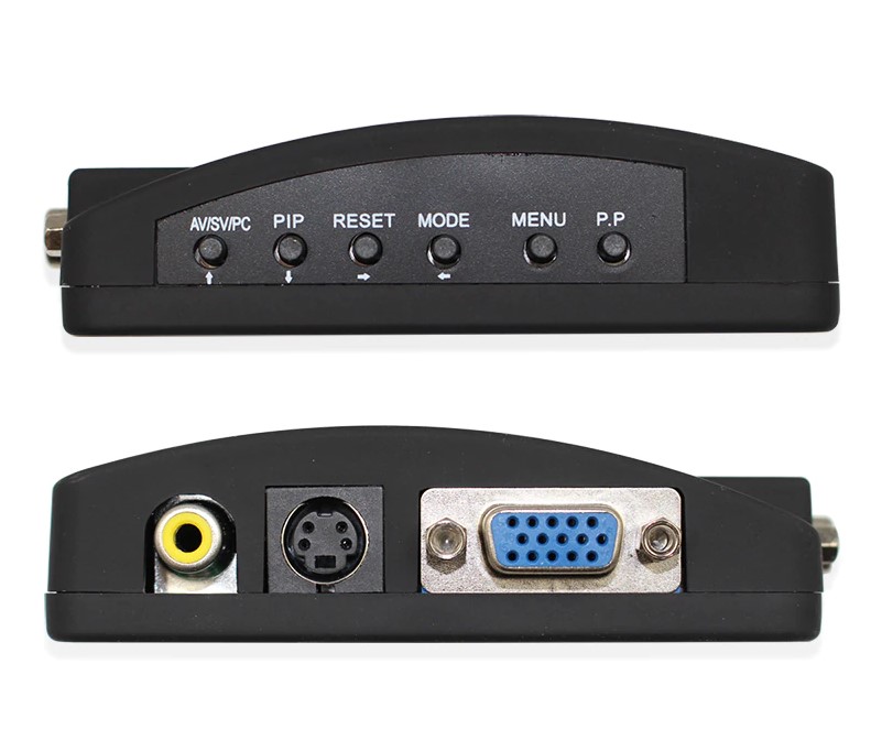RCA / AV / VGA / S-видео в VGA видео конвертер особенности с композитный RCA / AV / VGA / S-video вход, VGA выход. Идеально подходит для видеонаблюдения, DVD-плеер, цифровой Спутниковое телевидение (DSTV) с композитный RCA или S-video для отображения на мониторе VGA / TV для образования, бизнес-презентации, коммерческие поощрения, Конференции, выставки и т.д. Сигнал переключается легко между различными источник входного сигнала.