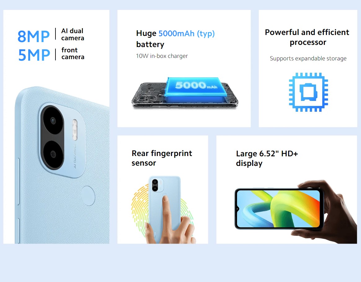 Смартфон Xiaomi Redmi A1 Plus 2/32GB Dual Sim IPS 6.52 EU Blue. Процессор MediaTek Helio A22 / ОЗУ 2 ГБ / 32 ГБ встроенной + microSD до 1 ТБ / камера 8+0.3 Мп + 5 Мп / 4G (LTE) / Bluetooth, Wi-Fi / GPS, A-GPS, GLONASS, Beidou / ОС Android 12.0 / 164.9х76.75х9.09 мм, 192 г / 5000 мАч.