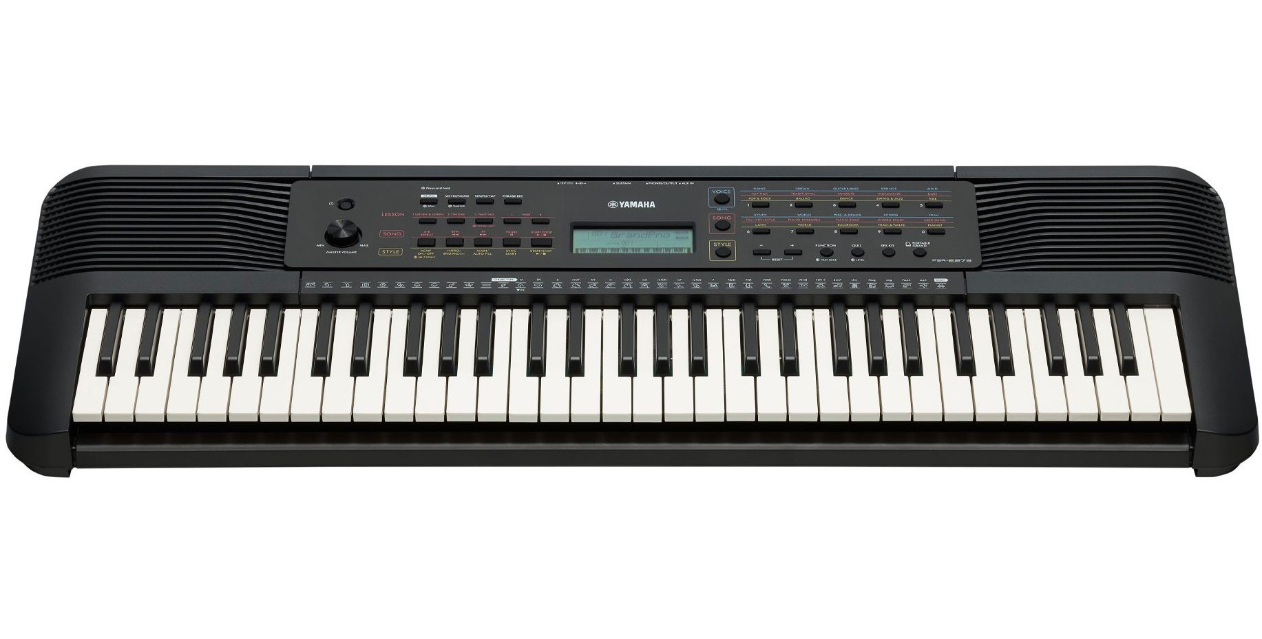 В памяти PSR-E273 ты найдешь сотни качественных тембров различных музыкальных инструментов: от фортепиано и оркестровых инструментов до гитар и барабанов. Если же ты просто хочешь поиграть на пианино — нажми кнопку [PORTABLE GRAND] и наслаждайся великолепными стереосэмплами акустического рояля.